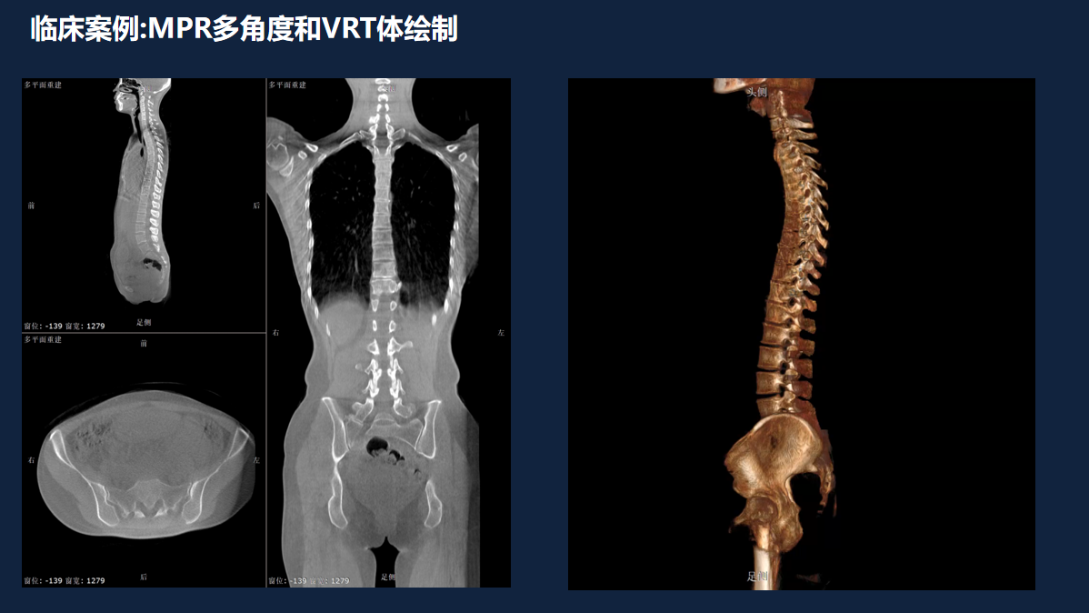 此项技术基于动态数字化X线技术平台打造,可实现立位三维成像,通过立位旋转站台带动病人缓慢转动,完成站立位下对检查部位的多角度扫描并且使用自动校正方式完成三维影像重建,剂量辐射水平远低于CT,同时也将原本DR的图像由二维扩展到三维,获得横断、矢状、冠状多方位图像。在精准呈现全身脊柱关节的立位三维摄影的同时更加真实地展示脊柱关节多种疾病的影像学信息,对脊柱关节疾病的相关手术方案规划、手术随访以及进展评估提供更加精准的影像学信息评估。