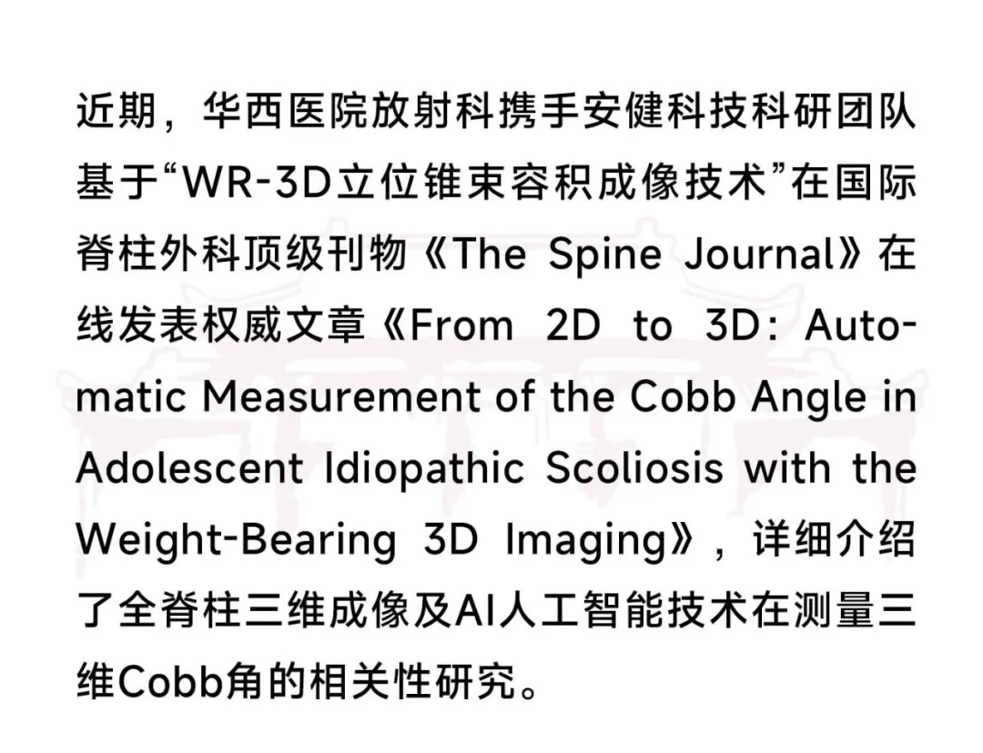 华西医院放射科与亿万28入口网页版-亿万28网页在线玩-万28官网下载最新版-亿万e网址pg-亿万28pg电子-亿万28赏金女王-亿万28娱乐科技科研团队通过WR-3D技术,对传统的二维和三维 Cobb角测量方法进行定量比较。针对不同患者、不同临床场景,提供丰富的数据支持,有助于医生制定最佳的诊疗方案。