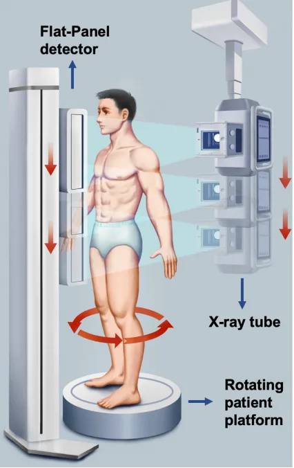 WR-3D立位锥束断层容积成像系统采用Cone-Beam锥束成像技术。通过旋转站台带动患者低速旋转,从不同角度捕获透视图像并重建出患者扫描部位的三维容积图像。锥束成像技术拥有更大的锥角及更大的Z轴覆盖范围,实现全脊柱区域完全覆盖。