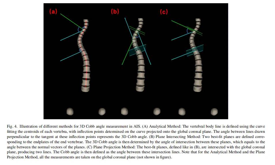 Analytical method(AM):椎体线被定义为最适合每个椎骨的质心(几何中心)的曲线。这些质心投影到全局冠状平面上(由连接股骨头和Z轴的线定义)。WR-3D系统将自动将曲线的拐点(凹度发生变化的地方)识别为测量点,然后在这些拐点处垂直于切线绘制直线,这些垂直线之间的角度为三维Cobb角(下图a)。