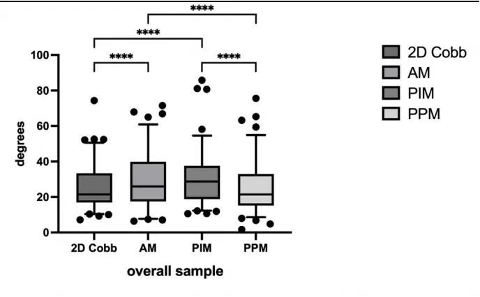 本次研究共招募了53名AIS患者,包括88条脊柱曲线,分别进行传统二维Cobb测量与立位三维Cobb角测量。二维Cobb角测量由经验丰富的医生手动测量;三维Cobb角测量则通过WR-3D技术,采用Analytical method (AM)、Plane intersecting method (PIM)、Plane projection method (PPM)三种不同的测量方法。