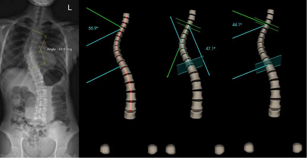 AIS需要准确的脊柱曲度评估才能进行有效的临床治疗。目前Cobb角测量是量化脊柱弯曲和脊柱侧弯严重程度的关键评估手段。传统的影像学检查一直采用的是二维Cobb角测量,虽然这种方法为初始诊断和监测疾病进展提供了一个依据,但因二维影像的限制,容易受到组织覆盖,X线投射角度变化,不同医生测量习惯不一样等原因,使测量值产生差异及诊断不一致。